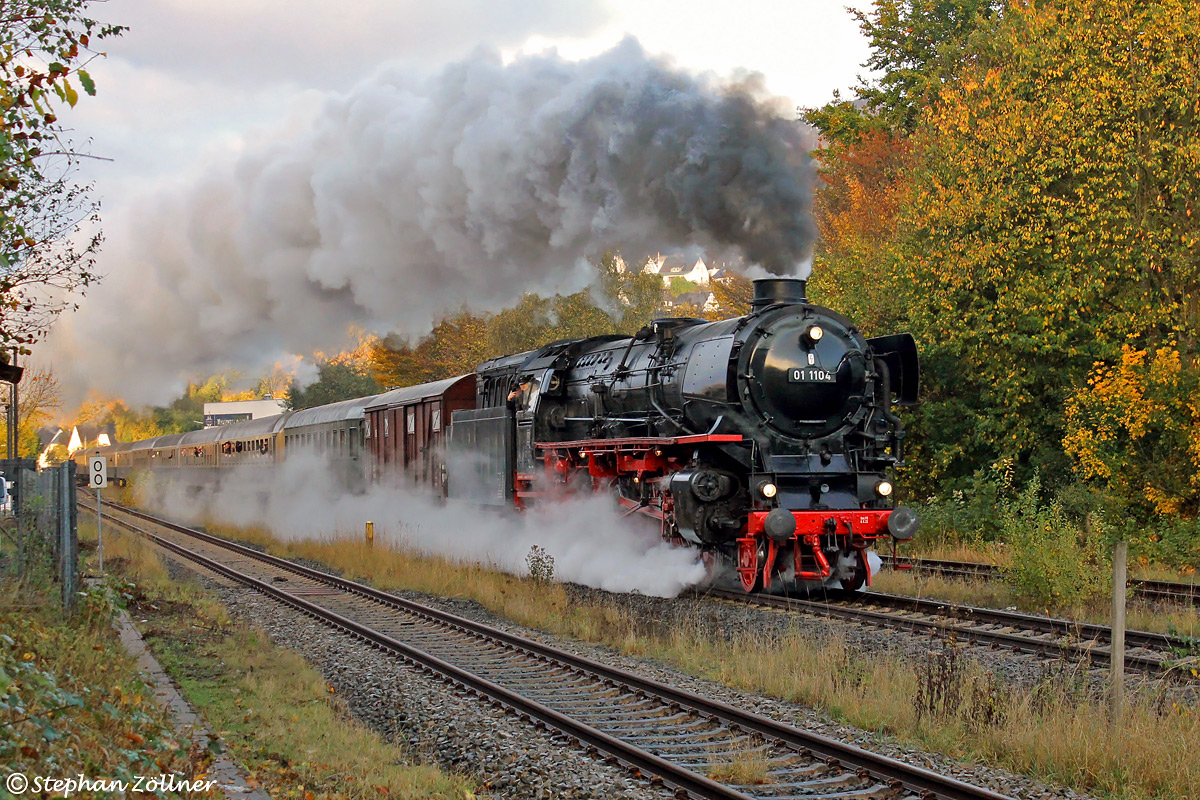 Für den 18. Oktober 2025 hatte die Arge NostalgieZugReisen zu einer Dampfzugfahrt nach Kassel und Eisenach eingeladen. Mit Zuglok 01 1104 vom Faszination Dampf e.V. bespannt wurde der Fahrweg durchs Obere Ruhrtal gewählt. Unterstützt von Schublok 218 137 des DB Museum nimmt der Zug morgens zum Sonnenaufgang in Nuttlar die Bergetappe nach Brilon Wald in Angriff.