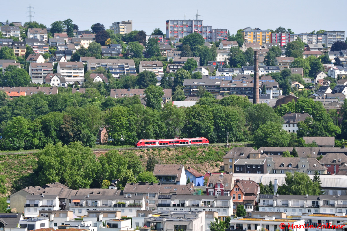 Zur Mittagszeit ist der "kleine Hai" 632 107 als RB 52 auf dem Weg von Dortmund nach Lüdenscheid, als er kurz nach erfolgter Zugkreuzung die Rampe vom Herdecker Bahnhof herunter auf das Ruhrviadukt zurollt. Auf Höhe des Einfahrsignals der Gegenrichtung wurde er dort vom Hagener Kaisberg aus mit viel "Tele" bildlich verwenigt.