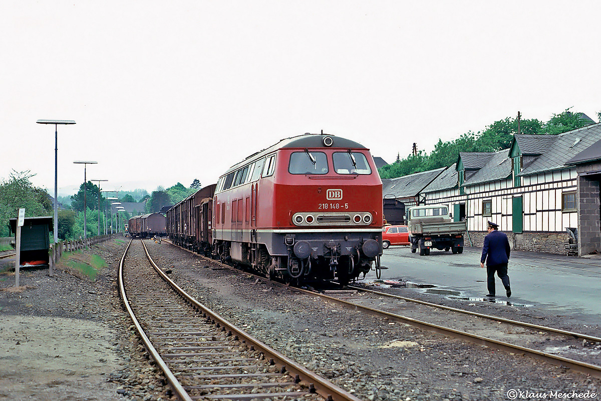In den siebziger Jahren war das Güteraufkommen nach Schmallenberg noch so hoch, dass als Zuglok für die Übergabe eine Maschine der BR 218 zum Einsatz kam. Am dunstigen 28. Mai 1976 war die Hagener 218 148 für diesen Dienst eingeteilt. Klaus Meschede fotografierte sie beim Zusammenstellen der Abgangswagen an der dortigen Ladestraße.