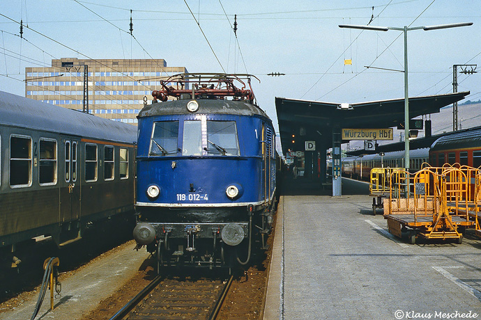 Wenige Tage vor der Außerdienststellung der Baureihe 118 begab sich Klaus Meschede im Mai 1984 ins Fränkische. Im Würzburger Hauptbahnhof traf er unter anderem auch 118 012 an, die er mit ihrem Personenzug während der Bremsprobe (siehe Bremsprobesignal am Bahnsteigdach) auf seinem Diafilm abbilden konnte.