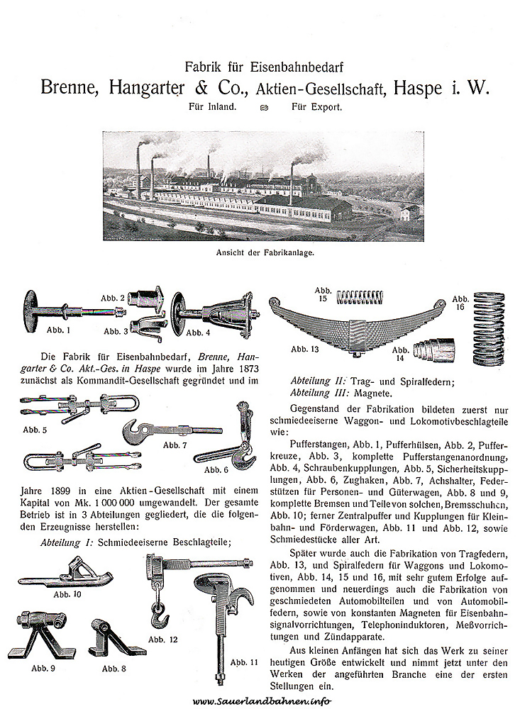 Brenne, Hangartner & Co, AG, Hagen Haspe gegründet: 1873 Produkte: Schmiedeeiserne Waggon- und Lokomotivbeschlagteile, Trag- und Spiralfedern Status: liquidiert |