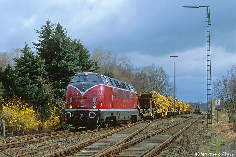 Km 179,6 Wickede, OstausfahrtDa fielen dem Fotografen am 18. März 2008 gleich mehrere schwere Steine vom Herzen, als sich an der Wickeder Ostausfahrt doch tatsächlich die Sonne durch die dichten Regenwolken kämpfte. Mit der Überführung des Bettungsreinigungszuges aus der Baustelle Bestwig – Eversberg polterte WLH V 200 017 dazu passend über die Ruhr- und Obergrabenbrücke in Richtung Recklinghausen, großes Glück gehabt. Die winzige Wolkenlücke spiegelt sich sogar auf den hochglänzend lackierten Rundungen von "Roswitha".