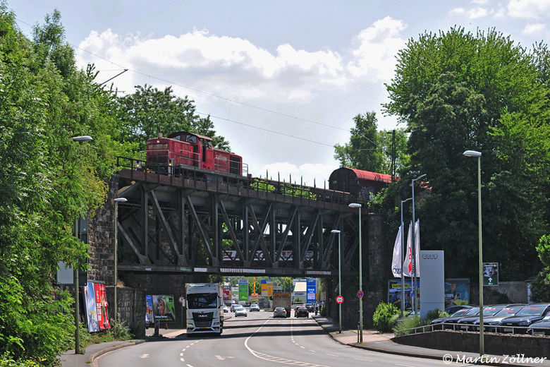 High Noon: Als Rangierfahrt ist 294 743 am 25. Juni 2025 im absoluten Hochlicht mit instandgesetzten Güterwagen auf dem Weg vom Wagenwerk in Eckesey zum Rangierbahnhof Vorhalle. Die Strecke 2822 wurde bereits am 15.12.2002 zum Bahnhofsgleis vom Bahnhof Vorhalle umgewandelt. Werktäglich sind mehrere Fahrten zum Austausch der Schadwagen dort unterwegs. Nur noch dieses eine Gleis über die B 54 ist in Betrieb, die unmittelbar daneben liegenden Brücken der Strecken nach Hengstey und Güterbahnhof lange schon stillgelegt.