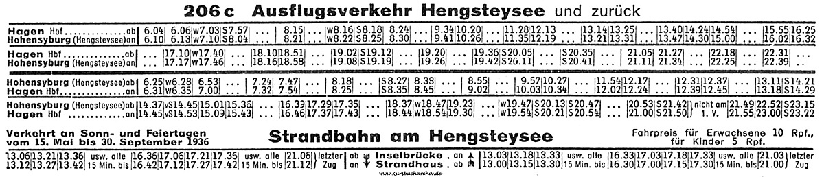 Der Sommerfahrplan 1936 weist exakt die gleichen Fahrzeiten auf der Strandbahn aus, die Anschlussverbindungen beschränken sich aber jetzt nur noch auf die Strecke von und nach Hagen Hbf: