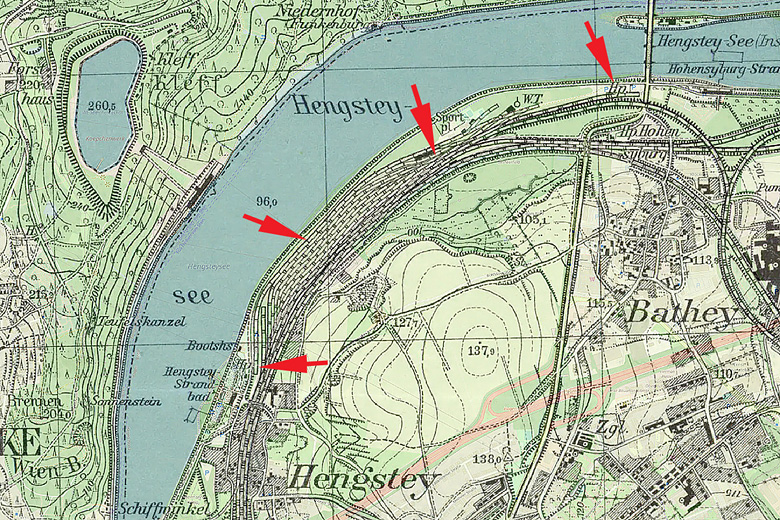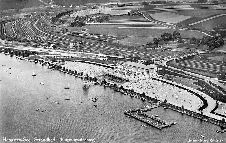 Im Mittelpunkt dieser Aufnahme sehen wir das repräsentative Strandhaus mit Freibad am Hengsteysee im Jahr 1932. Links davon hinter dem kleineren Gebäude befand sich der Bahnsteig des dortigen Haltepunktes der Strandbahn, wo die Züge von der Inselbrücke endeten. In der Vergrößerung ist die Stelle per Pfeil markiert.