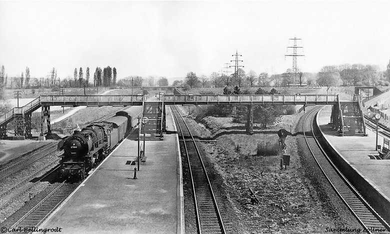 (Strecke 2550 km 148,380) Hp Hagen-Hohensyburg [.HOY]Es ist der 12. April 1957, als Carl Bellingrodt die Osnabrücker 01 1060 mit dem D 94 (Hamburg Altona – Köln Hbf) bei der Durchfahrt am erst 1930 für den Ausflugsverkehr zum Hengsteysee eingerichteten Hp Hohensyburg aufnahm. Zu dieser Zeit war sowohl der Bahnsteig an der Linie 2550 als auch der an der Ruhr-Sieg Strecke noch in Betrieb. Nach Aufgabe des Haltes an der Strecke 2800 (26.05.1962) wurde die Holzfußgängerbrücke entsprechend eingekürzt. Bis zum Sommer 1938 konnten die Ausflügler zum Hengsteysee die Treppe links benutzen und nach 100 Metern Fußweg am Haltepunkt Inselbrücke in die Strandbahn umsteigen.