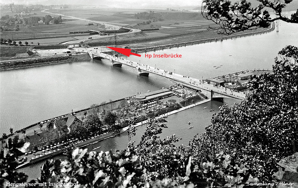 km 0,0 Hp Hohensyburg InselbrückeDer Haltepunkt Inselbrücke am Beginn der Strandbahn befand sich unterhalb des Bahndammes der Strecke nach Hagen-Kabel direkt neben der Verbandsstraße am verlängerten Ausziehgleis des Hengsteyer Ostablaufberges. Auf dieser Postkarte ist am oberen Bildrand links neben der Straßenbrücke schwach die hölzerne Fußgängerbrücke am Haltepunkt Hohensyburg sowie zwei gleichzeitig dort haltende Reisezüge zu erkennen. Gut auszumachen auch der kurze Fußweg bis zur Eisenbahnüberführung Strecke 2820. Da der Haltepunkt Inselbrücke auf dem Bild nicht genau auszumachen ist, haben wir die Stelle in der Vergrößerung mit einem Pfeil markiert.