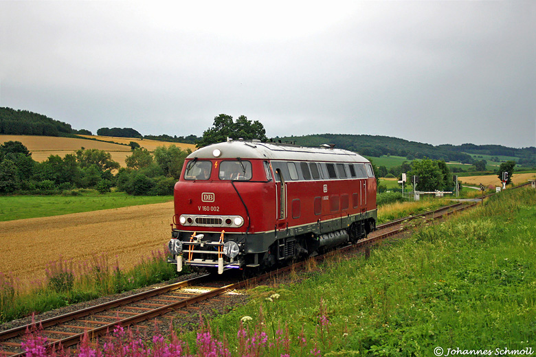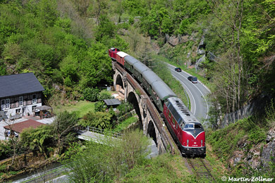 Zum großen Dampflokfest an der Eifelbahn in Gerolstein am 08. Oktober 1994 schickten die Eisenbahnfreunde Hönnetal einen Zubringerzug von Neuenrade aus auf die Reise. In Balve Helle bahnte sich passend zur Durchfahrt die Morgensonne eine Lücke durch die dichte Wolkendecke und ließ die beiden Zugloks V 200 116 (DB-Museum) und V 200 033 der Hammer EF glänzen wie eine Speckschwarte. Martin speicherte den DZ 20857 auf dem Mittelformatdiafilm für die Nachwelt ab.