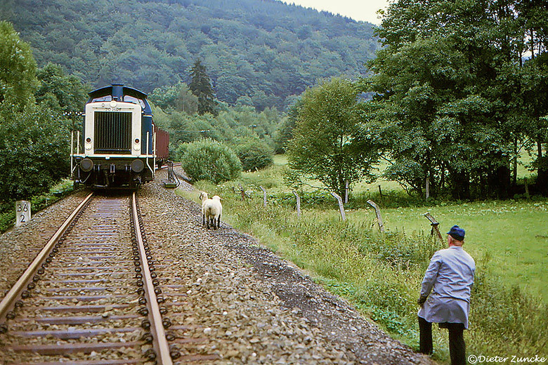 Km 36,2 bei Kläranlage ZüschenIn 1984 wurde die Übergabe im Nuhnetal nach Hallenberg erstmals planmäßig für ein Jahr mit der BR 212 gefahren. An einem dunstigen Sommertag im Juni fungierte Lokbi Willi F. nicht nur als Triebfahrzeugführer, sondern wurde auch bei einem außerplanmäßigen Halt auf der Rückfahrt nach Bestwig nahe der Kläranlage Züschen zum nebenamtlichen Tierfänger. Ob die beiden ausgebüxten Fellträger tatsächlich in Obhut genommen werden konnten ist allerdings nicht überliefert.