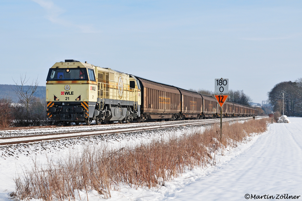 Der 26. Januar 2013 brachte kaltes, aber sonniges Winterwetter mit etwas Schnee bis in die Niederungen der Ruhrtals. Das wurde umgehend genutzt, den samstäglichen Spanplattentransport vom Eggerwerk Richtung Dänemark bildlich zu verewigen. Nach kurzer Wartezeit rollt die Bierkiste WLE 21 im gewohnten Zeitfenster bei Echthausen auf das Einfahrsignal Wickede zu.