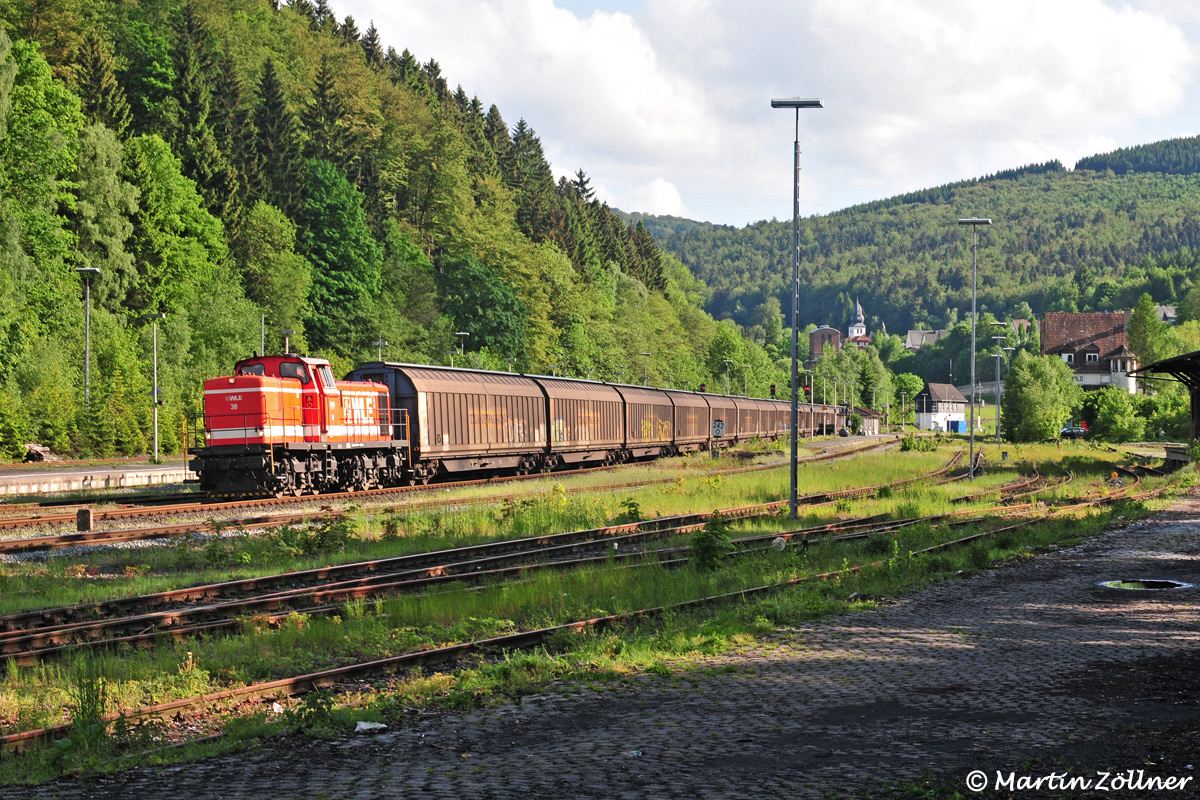Am Freitagabend, den 23. Mai 2014 weilt der Fotograf für ein paar Aufnahmen in Brilon Wald. Im letzten Licht erreicht die Deutzlok WLE 38 mit dem Spanplattenleerzug den Bahnhof, um nach Abholen der Weichenschlüssel am Stellwerk das letzte Stück der Bergetappe in Angriff zu nehmen.