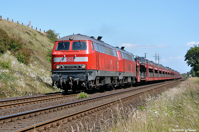 Die langjährig in Hagen beheimatete 218 131 zeigt am 23. Juni 2009 mit ihrer Schwester 181, das sie noch nicht zum alten Eisen gehört. Im schweren AutoZug-Dienst nach Sylt war sie noch bis zu ihrem Fristablauf im November 2009 hier anzutreffen. Bei Morsum hat AS 1438 die Nordseeinsel erreicht.