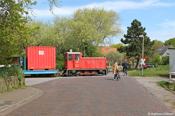 Am 08. Mai 2017 war 399 106 für die Beförderung des werktäglichen Güterzuges auf Wangerooge zuständig. Der Bahnübergang "Am alten Deich" liegt direkt im Bahnhofsbereich, wo die Maschine gerade zwei Wagen an die Ladestrasse rangiert.