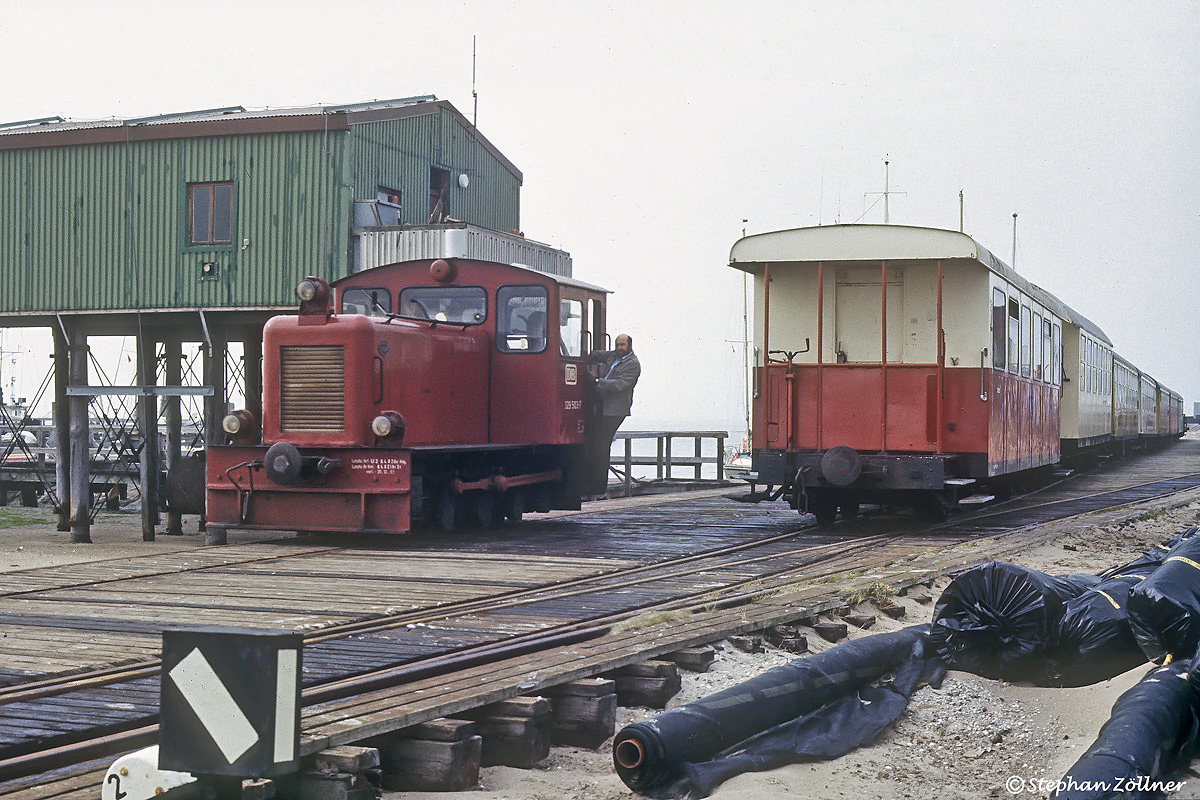 Im Jahr 1983 war der Wangerooger Westanleger noch holzbeplankt sowie alle drei vorhandenen Gleise in Betrieb. 329 503 konnte am 07. August bei dunstigem Wetter dort beim Umsetzen beobachtet werden.