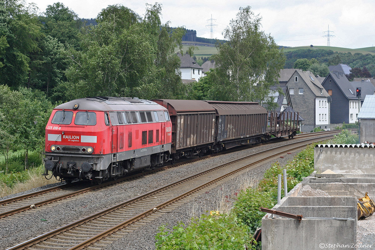 Ein kurzer Sonnenspot im Mittagshochlicht, das war die ganze Beleuchtungsausbeute bei fünf Fotoversuchen mit 225 010 am 16. Juli 2012. Der kurze, gut ins Blickfeld passende EK 62369 nach Schwerte konnte so an der Bestwiger Alfert bildlich verhaftet werden.