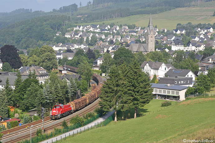 Noch bevor die Kurve an der Nuttlarer Standardfotostelle am Dümelskopf wieder zugewachsen war, konnte der sonnige 15. Juli 2013 noch für ein Bild des Eggerzuges mit der neuen Voith-Gravita genutzt werden. Pünktlich gegen zwanzig vor Zehn nimmt 265 011 mit ihren 1800 kW Motorleistung die Olsberger Rampe in Angriff.