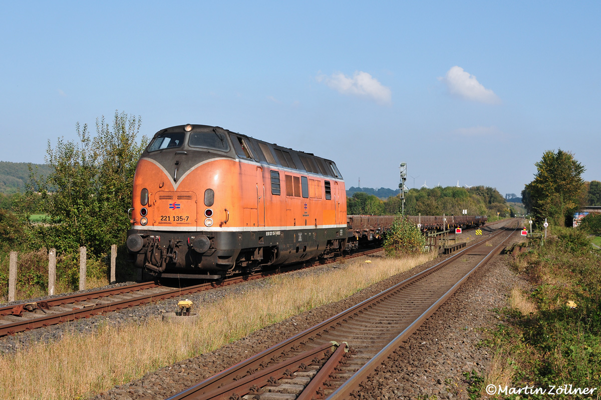 Als einzige Zugfahrt bei Tageslicht ist 221 135 der Bocholter Eisenbahn am Nachmittag des Feiertages 03. Oktober 2014 von der Altgleisabladestelle im Umschlagbahnhof Neheim-Hüsten zur Wiederbeladung im Bahnhof Wickede unterwegs, wo Bahnsteig- und Gleisbauarbeiten stattfinden. Auf dem Bild fährt sie gerade als Rangierfahrt in das Baugleis ein und passiert sogleich die Wickeder Ruhrbrücke.