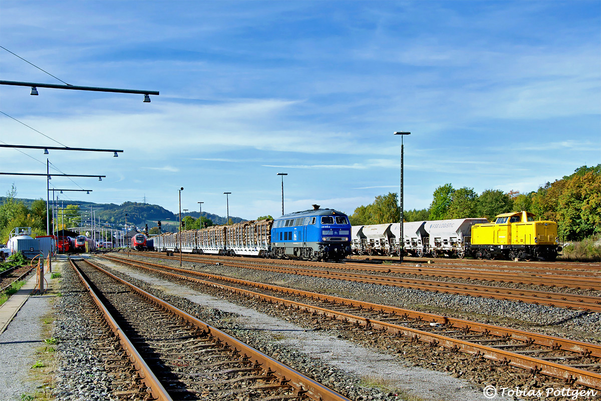 Bei der Zuführung des zweiten Teils eines Holzzuges zur Fa. Egger in Brilon am 10. Oktober 2022 von Hagen Gbf aus, wurde in Bestwig ein Tankstopp für die Zuglok 218 055 der Press eingelegt. Tobias Pöttgen war bei der Einfahrt im Gbf rechtzeitig zur Stelle und fertigte diese Aufnahme zusammen mit der abgestellten 212 306 an.