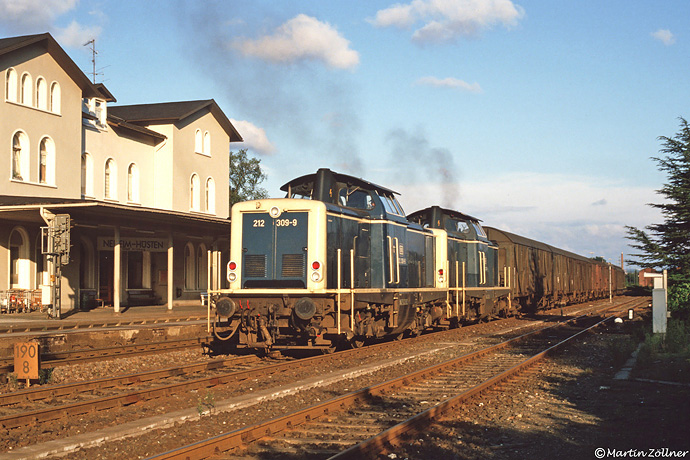 Auch am 25. August 1987 nahm der abendliche Expressgutzug von Brilon Wald nach Hagen Gbf in Neheim-Hüsten planmäßig weitere Wagen auf, unter anderem von der Postrampe. Dem Lokumlaufplan geschuldet kamen im Sommer 1987 vor dem Zug, der hier unter beachtlicher Grobstaubentwicklung den Bahnhof in Doppeltraktion verläßt, ab Neheim-Hüsten zwei Eckeseyer 212 zum Einsatz, hier 309 und 313.