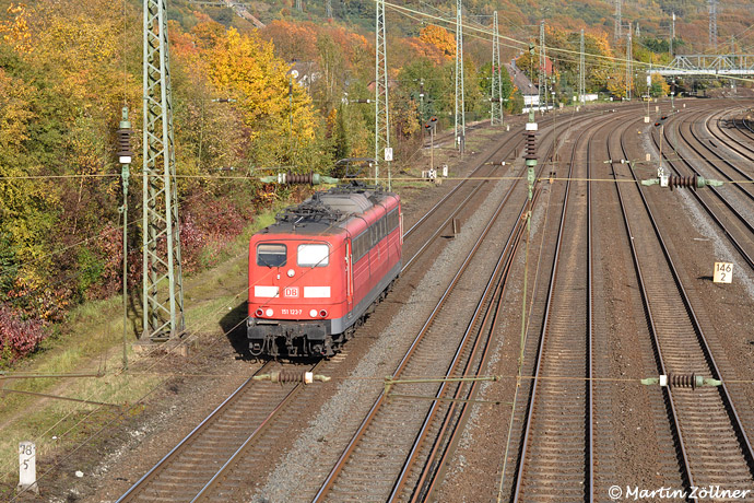Beim Warten auf den Brammenleerzug von Hohenlimburg konnte auch 151 123 als Beifang abgelichtet werden, die auf dem Weg zur Lokabstellung in Hagen-Vorhalle unterwegs war. Von der südlichen Brücke Seestraße in Hengstey ist es dabei schwierig, ein Bild ohne "Strippen" im Motiv umzusetzen.