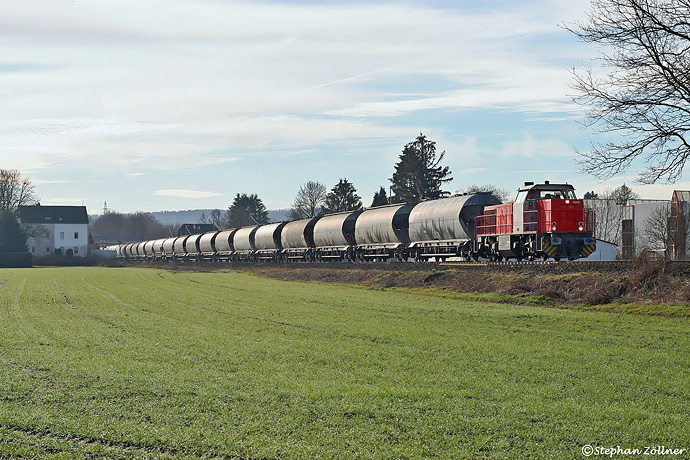 Während ab 01. Januar 2019 der Braunkohlestaubzug zwischen Spreewitz und Schwerte nun von Locon befördert wird, obliegt die "letzte Meile" bis zur Horlecke weiterhin der Traktion durch die Fa. Railflex. Am 14. Februar konnte der in der Gegenrichtung verkehrende Leerzug mit Leihlok 275 815 bei Bösperde im Streiflicht bildlich festgehalten werden.