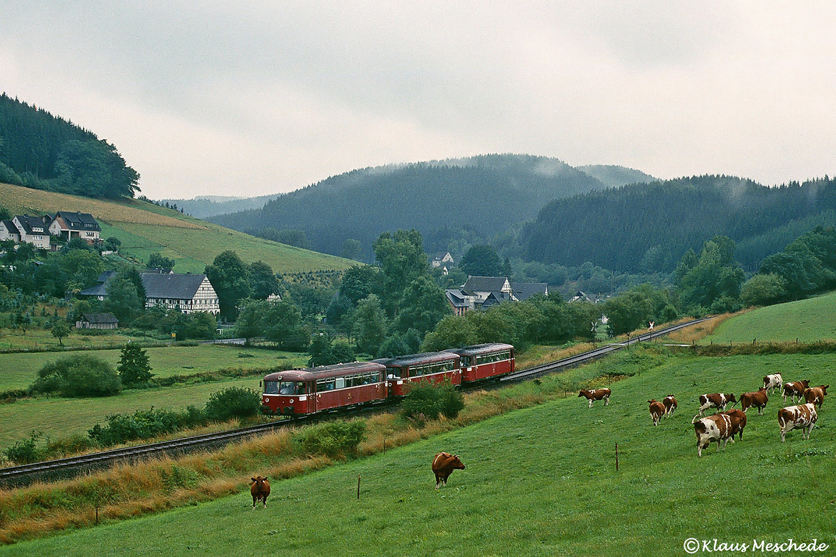 Am 26. und 27. August 1989 führte die Arge Nebenbahn eine zweitägige Rundfahrt mit Schienenbussen ab Kassel durch. Am ersten Tag ging es über Scherfede, Holzminden, Geseke Süd, Büren und Bestwig nach Hallenberg. Nach Übernachtung folgten am zweiten Tag Eslohe, Frankenberg ⁄ Eder und Hatzfeld. Trotz miserabelem Wetter ein Fotopflichttermin. Auch Klaus Meschede war zugegen und erwartete die Rückfahrt von Eslohe nach Frankenberg am frühen Morgen des 27.08. bei Sallinghausen.