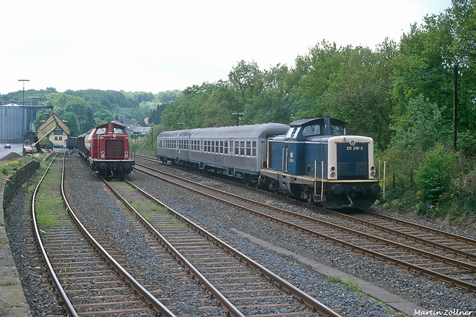Am dunstigen 14. Mai 1990 kam es im Bahnhof Kaisersesch zu diesem 211-Treffen zwischen 211 218, welche den N 7073 von Gerolstein nach Mayen Ost zu bringen hatte und 211 133, die mit der Übergabe nach Koblenz dem Personenzug folgen wird.