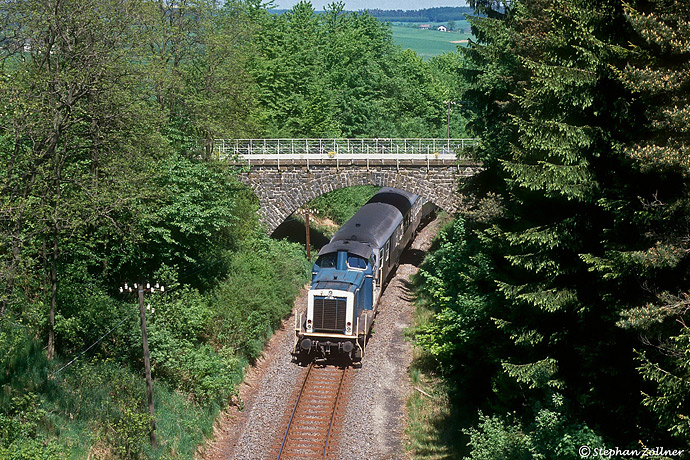 Mitten im Wald bei Utzerath befindet sich diese schöne Natursteinbrücke. Am 18. Mai 1990 unterquert die Trierer 211 029 das Bauwerk mit dem N 7070 auf dem Weg von Mayen Ost nach Gerolstein. Die Brücke der B 259 diente als Aussichtspunkt.