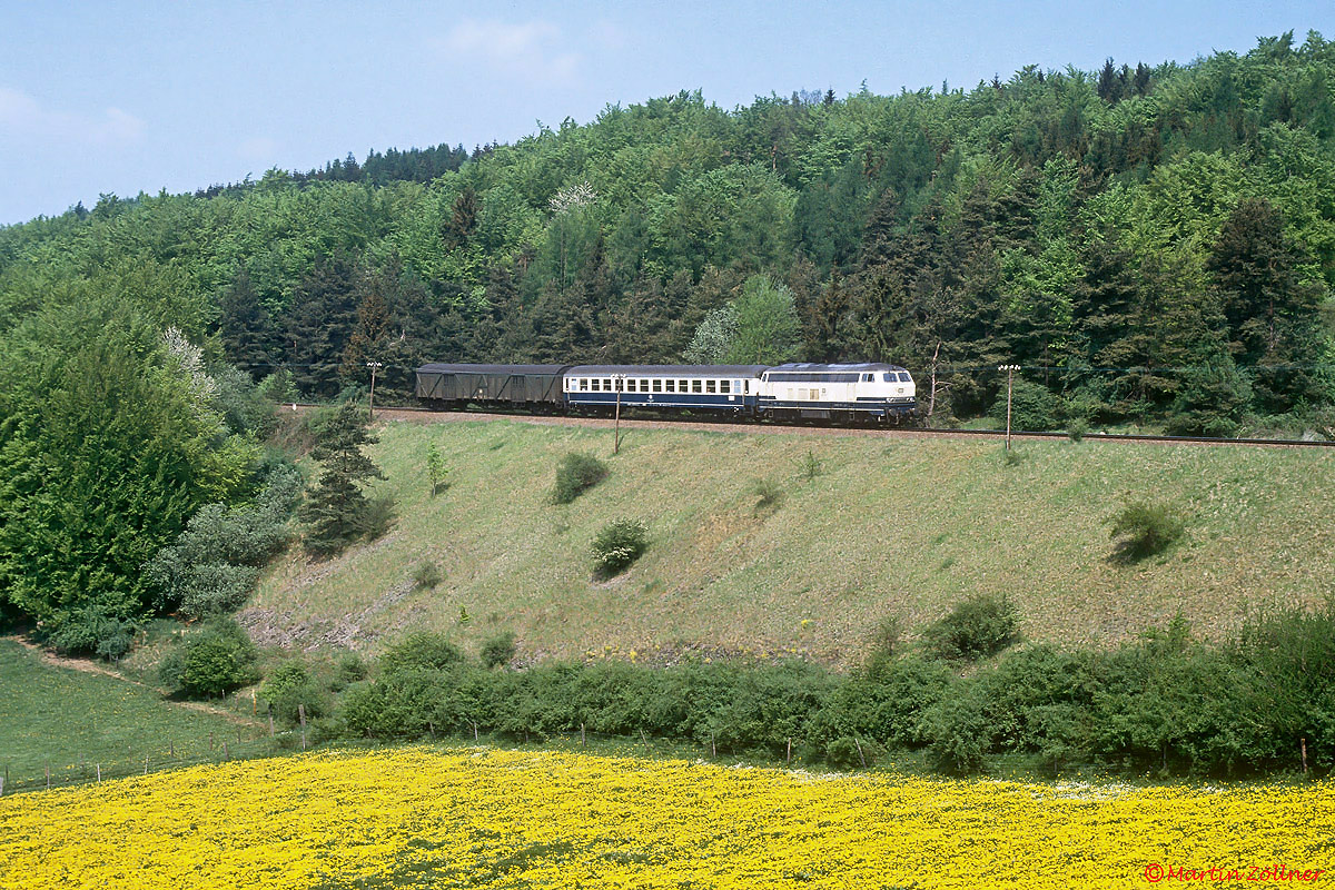 Unterhalb des sehr hohen Högemanndamm´s bei Eimelrod (bekannt durch und benannt nach einem Eisenbahnfotographen aus Gütersloh) erstreckte sich am 08. Mai 1990 ein wahres Löwenzahnblütenmeer, als die Kasseler 216 101 mit dem kurzen Eilzug 3993 nach Bad Wildungen gen Korbach vorbeirollte.