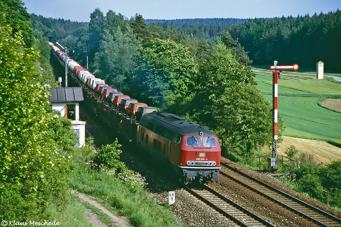 Zwischen Neukirchen und Sulzbach-Rosenberg lag einsam in der Nähe des Weilers Obermainshof die Blockstelle Mainshof. Im Juni 1985, als Klaus Meschede ihr einen Besuch abstattete, war sie noch besetzt und in Betrieb. Für den von 218 200 traktionierten und in Richtung Nürnberg fahrenden Ganzzug mit neuen Pkw der Marke Lada signalisierte der Wärter entsprechend Hp 1.