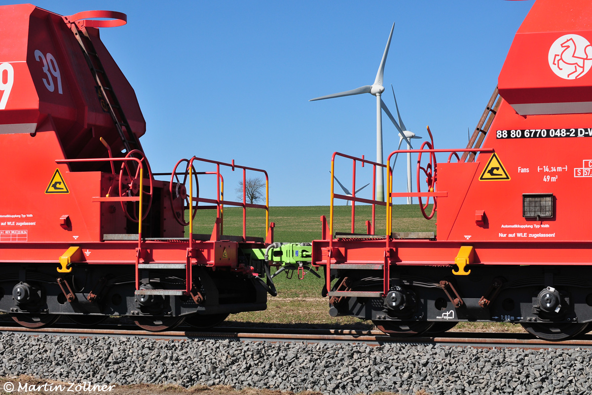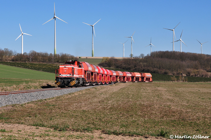 Kurz vor Mittag erklimmt die im Februar von der RLG übernommene ehemalige Hammer Ortslok 54 am 19. März 2025 die Haarstrangüberquerung in der Nähe des alten Haltpunktes Drewer. Im Zugverband sind bei dieser Garnitur auch die beiden als Betriebsversuch mit der digitalen Kupplung von Voith verbundenen Fa-Wagenpärchen 47 – 31 und 39 – 52 eingereiht.