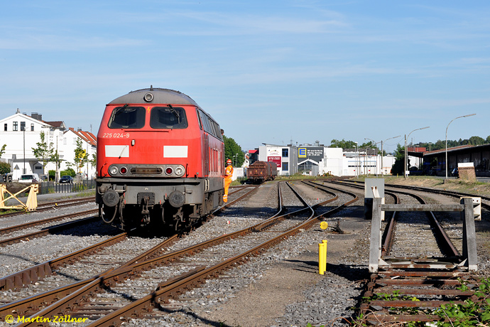 Abends holt DB Schenker die Abgangswagen der Ruhr-Lippe-Eisenbahn aus dem Neheimer RLG-Bahnhof zum Schwerter Güterbahnhof ab. 225 024 vertritt die planmäßige Schwerter 294 und rangiert zum Umsetzen in den DB-Bahnhofsteil vor den Abgangszug. Dieser besteht am 23. Juli 2012 neben zwei E-Wagen der Schrotthändler Geue (Hüsten West) und Rump (Hüsten Ost) aus mitgebrachten, leeren Coilwagen (Wickede, Fa. Westfalenstahl).