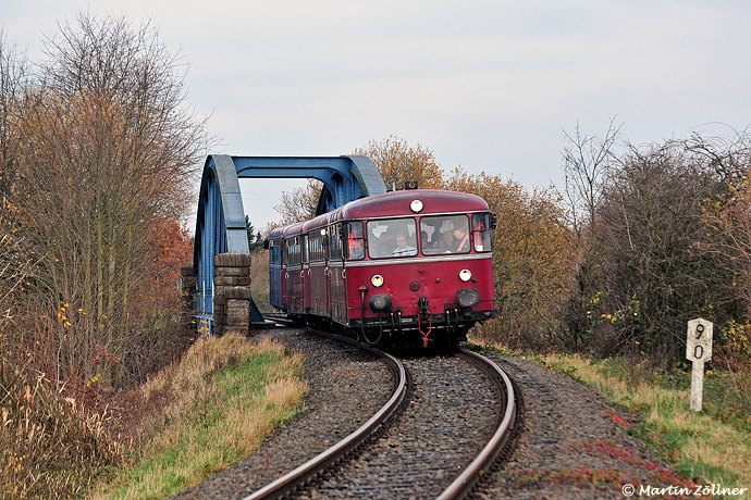 Am frühen Nachmittag des 25. November 2017 ist die von der Vulkaneifelbahn Gerolstein übernommene Schienenbuseinheit des FSB Menden als vorletzte selbst organisierte Fahrt auf der RLG-Güterstrecke im Hammer Nordosten unterwegs. Auf der Rückfahrt von Lippborg wurde mit der DGEG-Reisegruppe an Bord soeben mit der Brücke über den Datteln-Hamm-Kanal eines der markanten Bauwerke im Streckenverlauf überquert.