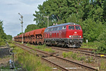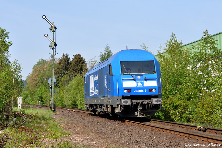 Auf Signal HP 2 rollt 253 014 der PRESS auf dem Weg von Brilon-Egger nach Warburg am in km 282,544 aufgestellten Einfahrsignal "A" zur Zugkreuzung mit dem Personenverkehr vorbei in den Bahnhof. Vor dem Rückbau auf eingleisigen Betrieb Ende 1984 stand das Signal noch in km 282,187. Am 06. Mai 2011 galt es, einen zweiten Zugteil mit Rohholz für das Eggerwerk aus der Zwischenabstellung im Warburger Güterbahnhof abzuholen.