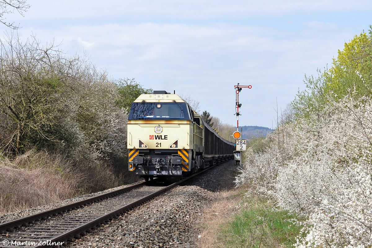 Am 16. April 2011 hat auch im Eggegebirge der Frühling Einzug gehalten. Mit dem umgeleiteten Spanplattenzug von Brilon-Egger nach Esbjerg (DK) beschleunigt die "Bierkiste" WLE 21 nach Zugkreuzung mit einem VT 612-Doppel unter Volllast aus dem Bahnhof Scherfede und passiert dabei mit Teilziel Lippstadt die auf der Trasse des ehemaligen zweiten Gleises aufgestellte Formsignalkombination an der Osteinfahrt.
