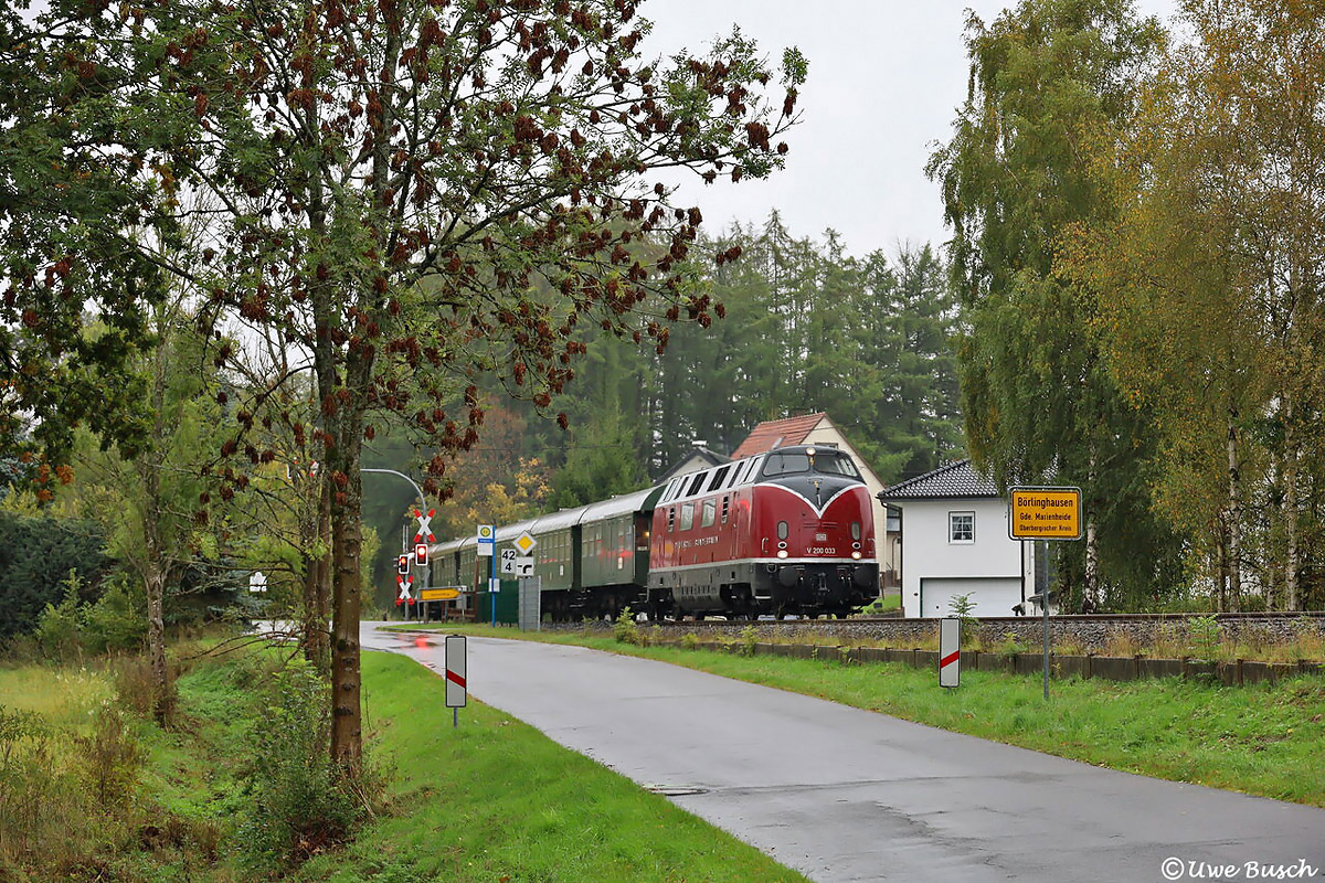 Km 42,4 Ortslage BörlinghausenDer sonntägliche Herbstausflug der Museumseisenbahn Hamm mit deren V 200 033 und dem Wirtschaftswunderzug führte am 05. Oktober 2025 in das Bergische Land zum Eisenbahnmuseum nach Dieringhausen. Uwe Busch konnte die Hinfahrt bei bescheidenen Wetterverhältnissen unter anderem auch in der Ortslage Börlinghausen bildlich festhalten.