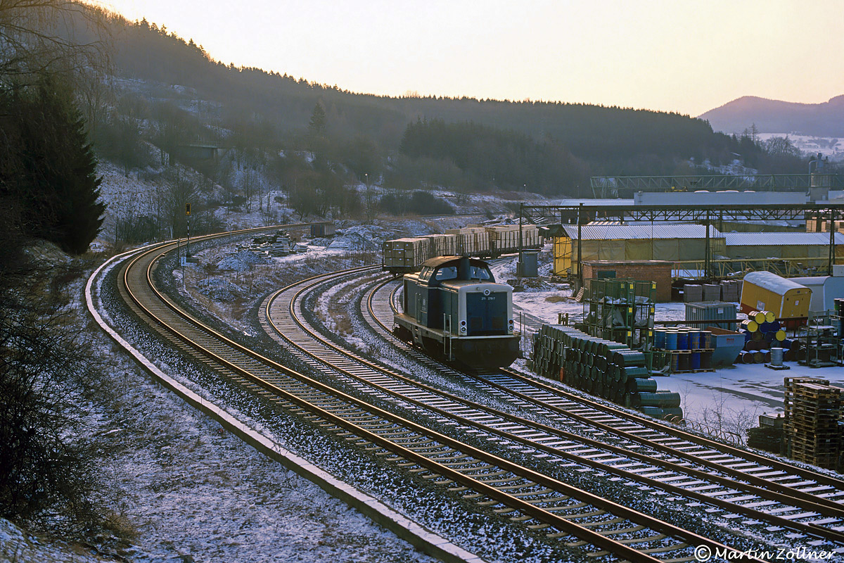 Noch vor Sonnenaufgang hat 211 278 am frostigen Morgen des 14. Februar 1994 die aus Bestwig mitgebrachten Schnittholzwagen bei der Firma Hüttemann umfahren und wird sie sogleich zum Abladen in die Werkhalle drücken. Martin war an diesem wolkenlosen Tag früh aufgestanden und drückte mit klammen Fingern auf den Auslöser.