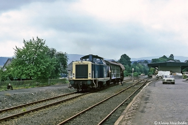 An einem wolkigen Sommertag im Jahr 1980 verfolgte Klaus Meschede die Schmallenberger Übergabe mit dem Auto. Während des Rangierens im Endbahnhof kam es an der Ladestraße zur Begegnung von Zuglok 212 298 mit diesem antiquierten Sternenträger.