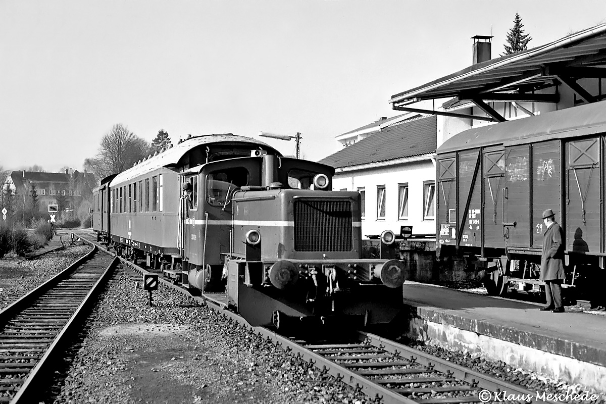 Am Samstag, den 10. April 1976 bestand für Eisenbahnfreunde die Möglichkeit zwölf Jahre nach Einstellung des Personenverkehrs in einem der planmäßigen Übergabe aus Meschede beigestellten Personenwagen die Strecke nach Schmallenberg zu bereisen, seinerzeit Leistung der Mescheder Bahnhof-Köf. Auf dem Bild von Klaus Meschede setzt 332 142 nach erfolgtem Rangiergeschäft rückwärts vor dem Schmallenberger Bahnhofsgebäude zur Fahrt an die Ruhr ins Hauptgleis um. Dabei wird auch der zu dieser Zeit noch mit Blinklicht gesicherte BÜ an der B 236 Bahnhofstraße genutzt.