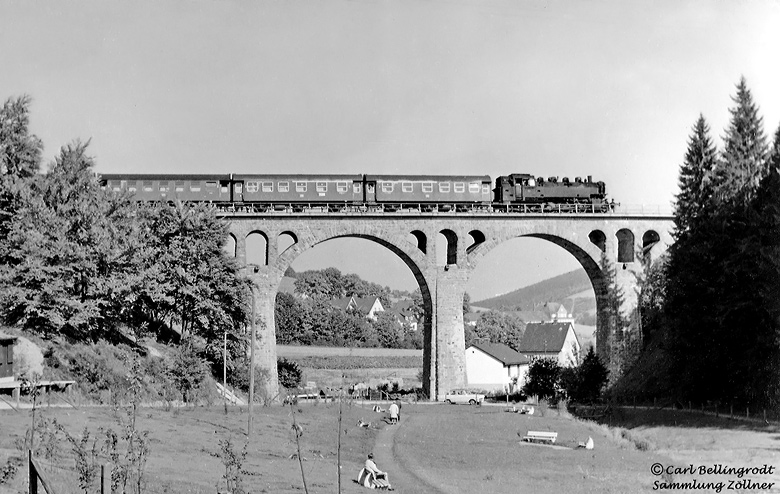 Km 61,5 Willinger Viadukt25. Juni 1939: schlechtes Wetter im Upland. Carl Bellingrodt hatte sich trotzdem mit seiner Plattenkamera in den Wiesen unterhalb des Willinger Viaduktes postiert. Vor die Linse kam ihm die Kasseler 93 097, welche rückwärts mit dem P 377 nach Bad Wildungen in Richtung Usseln dampfte. Auffallend die im Vergleich zu heute erst wenigen, vorhandenen Wohnhäuser im Ort.