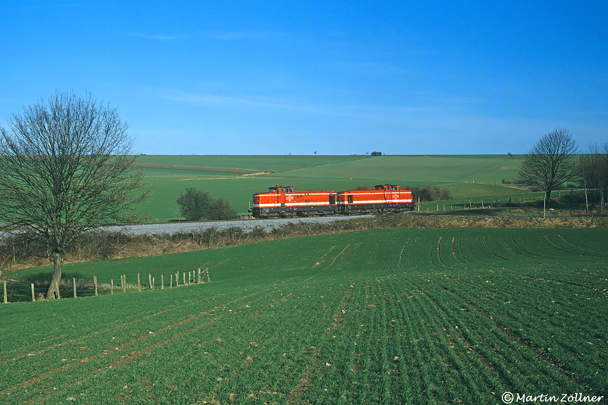 Am Vormittag des 22. Februar 1995 stand bei der WLE die Abfuhr eines Getreidezuges von der Fa. Kleeschulte in Rüthen zum Hafen nach Antwerpen an. Für diese Leistung wurden die Loks 35 und 36 in Doppeltraktion Lz aus Neubeckum zugeführt, ab Belecke noch zur Verstärkung die 62 beigegeben. Am ehemaligen Haltepunkt Drewer rollen die beiden Deutzer in der Morgensonne ins Möhnetal hinunter, auf den Höhen der Soester Börde ist zu diesem Zeitpunkt noch nicht ein einziges Windrad auszumachen.