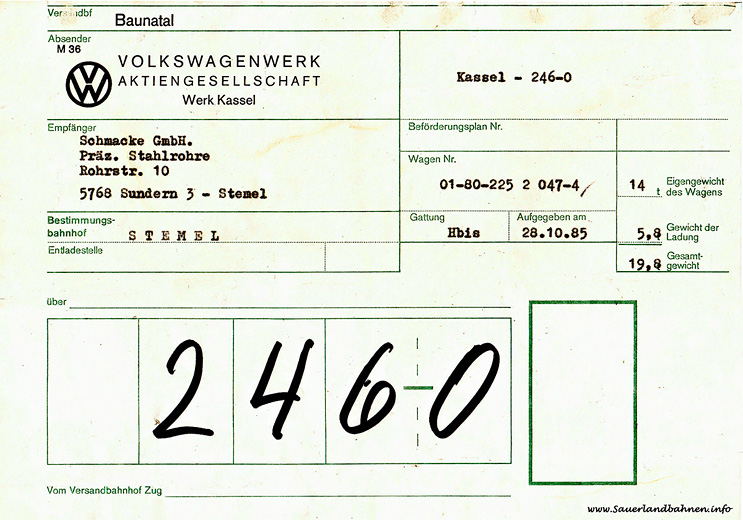 Km 11,574 Gla Westfalenwerk (Fa. Schmacke & Kumpmann)Ein guter Kunde der Fa. Schmacke & Kumpmann war das Volkswagenwerk in Kassel. Durchschnittlich zwei bis drei Hbis-Wagen mit Zulieferteilen wurden pro Woche dorthin abgefertigt. Äußerst selten war aber der Empfang beladener Wagen im Anschlussgleis. Ende Oktober 1985 konnte mal als Beweis der Laufzettel eines Eingangswagens von VW aus Baunatal sichergestellt werden. Ob darin nun leere Ladegestelle oder Warenrückläufer transportiert wurden ist nicht weiter bekannt.