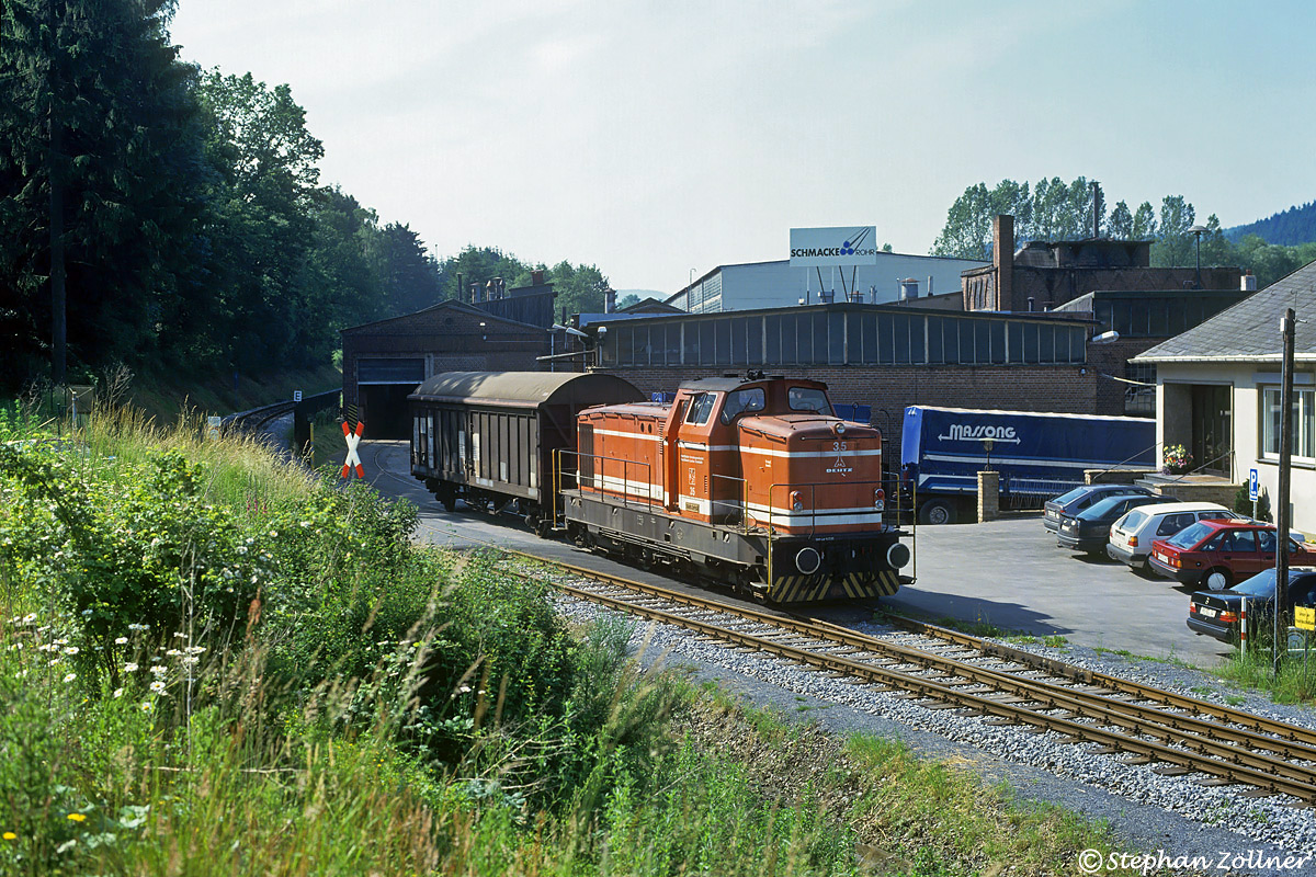 Nachdem Lok WLE 35 mit dem morgendlichen Zug 21 am 03. Juli 1991 im Bahnhof Sundern alle Rangierarbeiten erledigte hatte, wurde auf der Rückfahrt nach Neheim-Hüsten noch der Anschluss Westfalenwerk bedient, hier bei der Zustellung eines Hbis-Wagens zur Beladung fürs Volkswagenwerk in Baunatal aufgenommen.