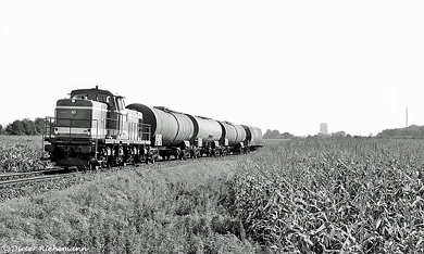 Mit je zwei Kesselwagen Hexamethylendiamin und Adipinsäure, zu AH-Salz zusammengefügt der Grundstoff zur Nylon™-Herstellung, rollt die Hammer Ortslok RLG 54 am 10. November 2023 mit ihrer wie hier schon seit Betriebsaufnahme 1970 angehängten Last auf das Du Pont-Werk im Uentroper Süden zu. Allerdings nicht mehr lange, war doch das Ende der energieintensiven Basispolymerherstellung (Erdgaskraftwerk) an diesem erst Ende 2022 vom ewigen Konkurrenten Celanese übernommenen Standort Mitte Januar 2024 bereits beschlossen, 170 Arbeitsplätze gingen dabei verloren.