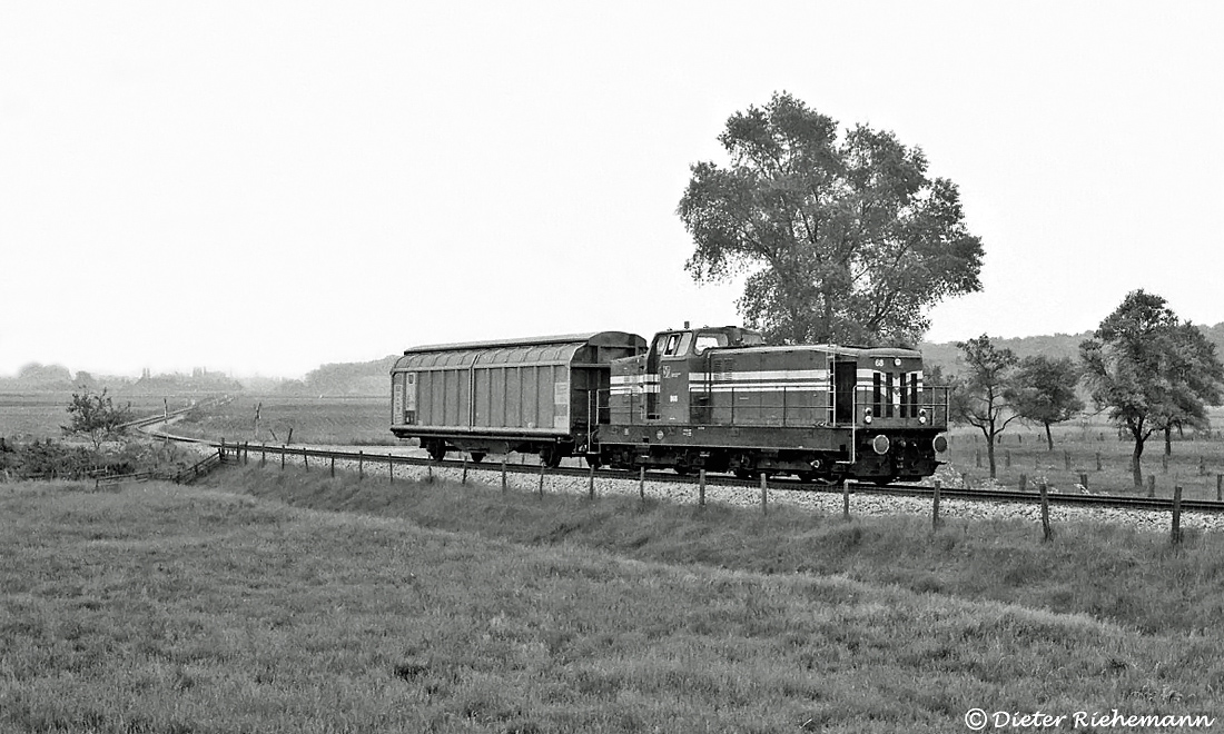 Flach und ohne Höhepunkte verläuft die Anschlussbahn nach Uentrop Süd durch das Gelände, sodass die wenigen Fotostellen auch noch fast alle gleich aussehen. Am 06. Mai 1983 kommt RLG D 64 vom DuPont-Werk zurück und wird am Streckenkilometer 0,5 bildlich festgehalten.