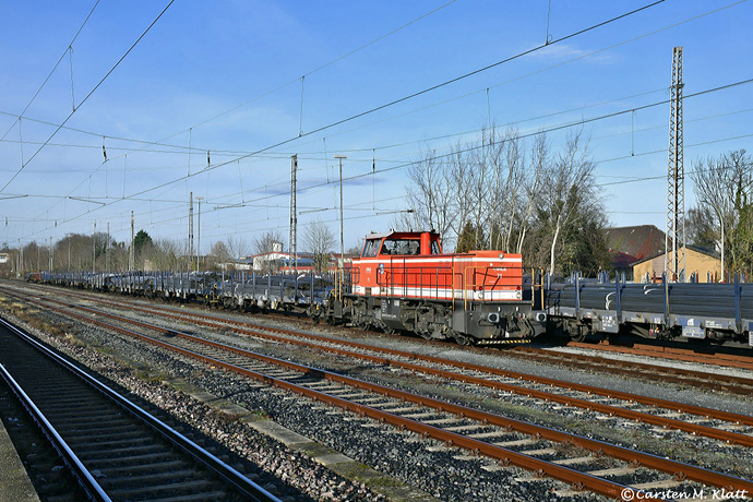 Seit Anfang September 2025 führt die WLE einen flexiblen Transport zur Zwischenlagerung von überschüssigem Material ("Tubes") auf Flachwagen (Rns-z, Rens) zwischen dem Benteler-Werk in Schloß Neuhaus und der EOW-Anlage im Bf Geseke durch. Je nach Bedarf pendeln die Züge beladen oder leer zwischen den beiden Standorten. Carsten Klatt beobachtete WLE 71 bei Rangierarbeiten am 12. Dezember 2025 in Geseke.