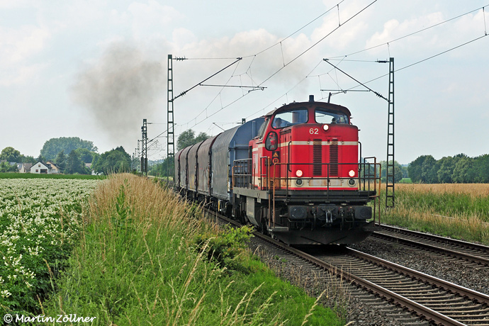 Leider nicht von vollem Erfolg gekönt war die Bilddokumentation des sehr seltenen Einsatzes der MaK-Lok WLE 62 vor dem Enercon-Stahlpendel zwischen Lippstadt und Bochum am 15. Juni 2018. Als die Maschine mit den fünf Wägelchen an dem Kartoffelacker bei Steinen Richtung Soest vorbeiräuchert, schlägt die berühmte Fotowolke vom Dienst unbarmherzig zu...