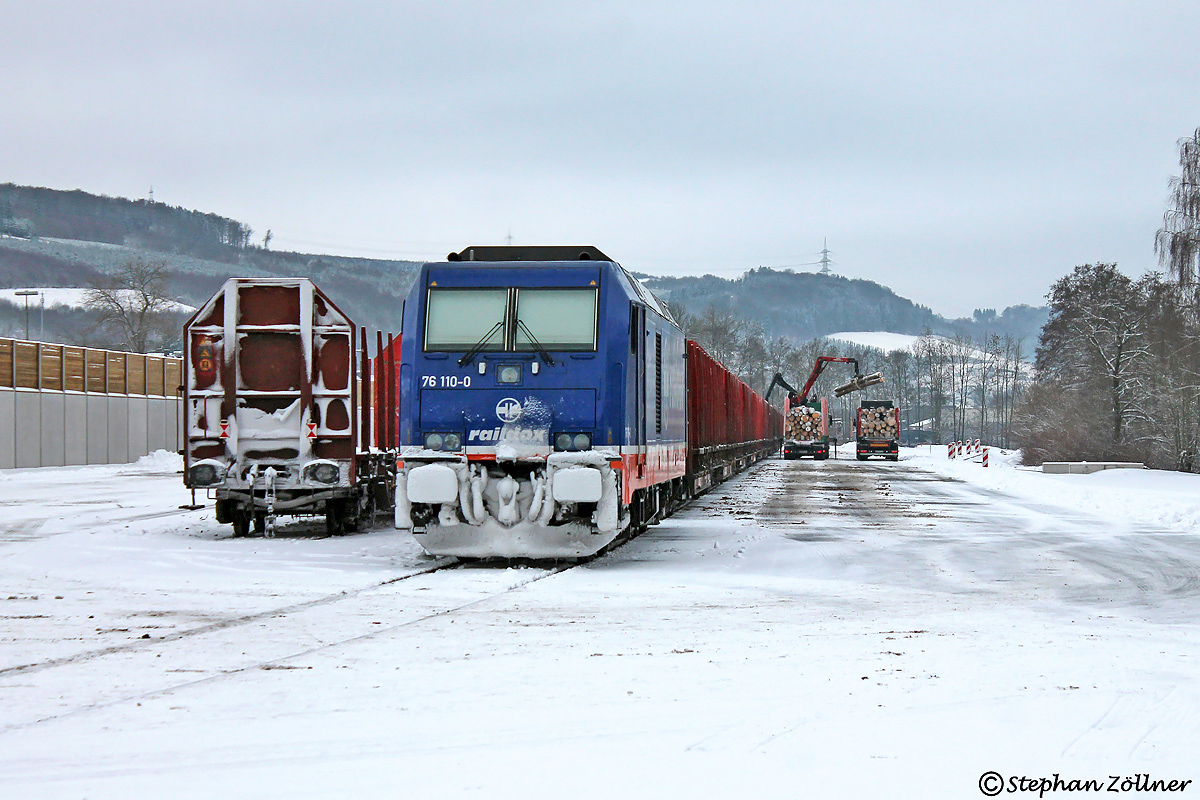 Die erste Bedienung des neuen Anschlussgleises der Team Timber GmbH in Bestwig fand am 26. Januar 2026 statt. Einen Tag später, am 27.01., wartete die Raildox 76 110 gegen Mittag noch auf die Entladung der letzten Wagen, als dieses Bild bei winterlichen Verhältnissen auf den Chip gebracht werden konnte.