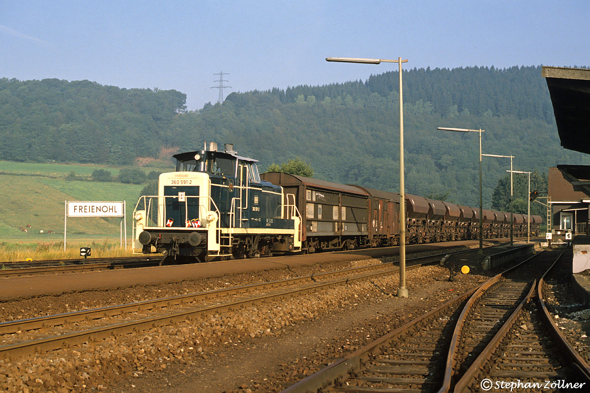 Am sonnigen Morgen des 24. August 1988 wurde mal wieder der Übergabe nach Schmallenberg mit der Kamera aufgelauert. Eine erste Aufnahme entstand bei der Durchfahrt in Freienohl, wo zu dieser Zeit noch beide Gleise neben der Ladestraße bis vor den Güterschuppen vorhanden und so bei Bedarf ein Umsetzen der Lok gleich hier möglich war.