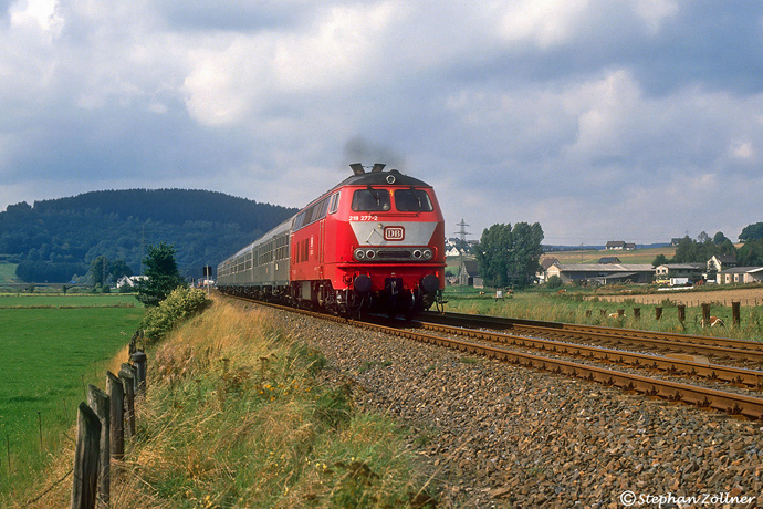 Im Herbst 1990 war die Braunschweiger 218 277 von Hagen aus als Leihlok eingesetzt. Am stark bewölkten 18. September bespannte sie den E 3895 nach Kassel, der beim Gut Bockum in einer kleinen Sonnenlücke auf Diafilm abgebildet werden konnte.